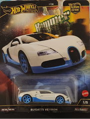 A modern hypercar icon in collectible form, this Hot Wheels Premium Bugatti Veyron features detailed styling, Real Riders wheels, and a metal body and chassis for an elevated collector feel. Part of the Car Culture Hammer Drop series, this 1:64 scale model captures the distinctive design and performance presence of the legendary Veyron.